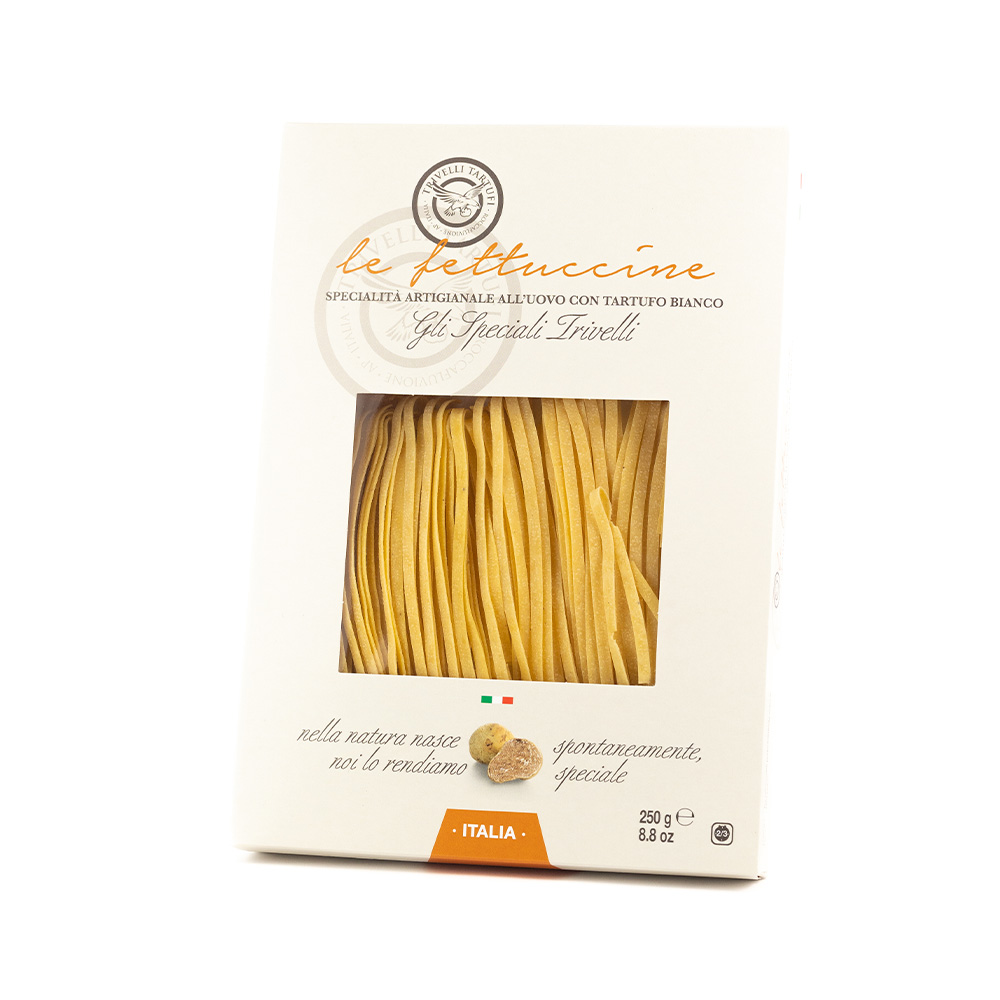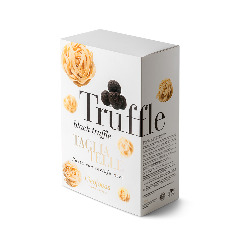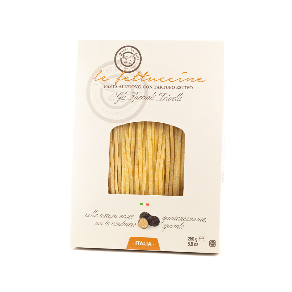 Handgemachte Tagliatelle mit dem unverwechselbaren Geschmack und Duft der schwarzen Sommer Trüffel in edlem Karton